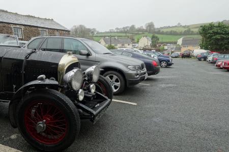 Our steeds await on a slightly soggy day, while we enjoy lunch at the Arundel Arms, Lifton.